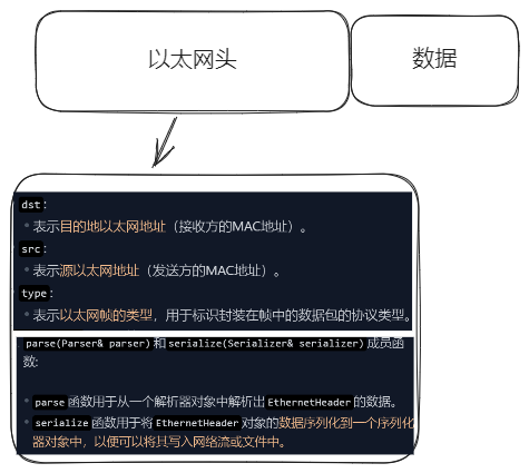 ARP 包和 ipv 4 包,最大的不同其实也就是以太网包的东西不同,以太网有一个以太网头部和以太网主体部分,以太网头部存储的只有 mac 地址(发送和接收,Ip 的部分分析是由主体部分进行一个拆包实现的,对其包涵的东西进行一个拆包,但是主体仍然存在 mac 地址,这个 mac 地址才是真正需要去注意的,他们只是套着以太网帧的头套干着不同的事情