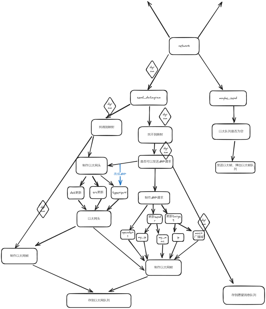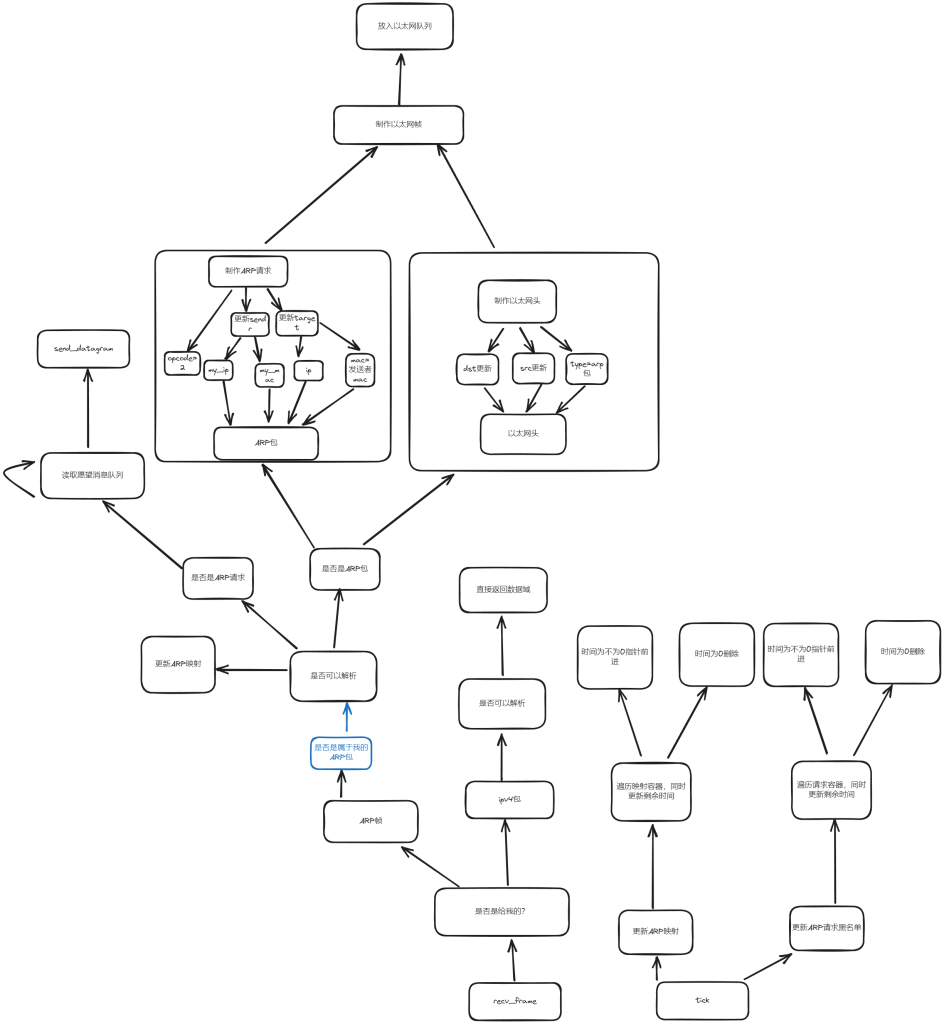做着这部分最好的就是了解一下报文的类型,和结构关系。我当时做的时候在里面绕了很多弯,比如说误以为ARP以太网包是带普通数据报的,当时想是ARP顺便发过去,后面发现不是,ARP以太网包只含ARP,普通数据以太网包只含普通数据报文(IPV4)。