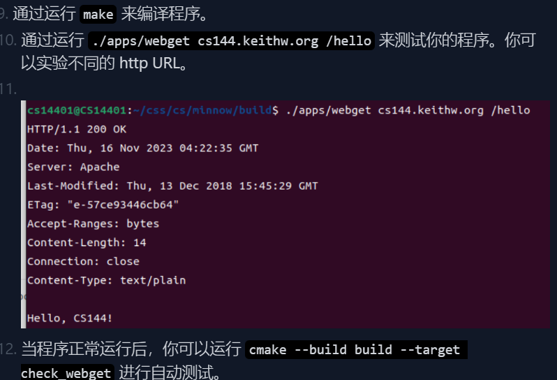 然后再同级目录下就可以调用 make 文件来生成可执行文件了,cs 144 中 lab 0 也是如此,其中 make 的动作用处就是制作可执行文件 webget,然后传入两个参数的同时调用程序
